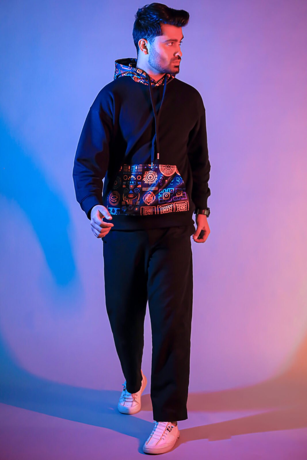 Stay warm and stylish with this Premium Imported Cotton Fleece Hoodie, crafted for ultimate comfort and modern appeal. The Ethnic hoodie features a unique multicolor ethnic print on the hood and front pocket, adding a vibrant touch to the classic navy base. Made from soft and durable imported cotton fleece, it provides excellent warmth while remaining breathable and cozy.